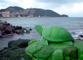 傷ついた大海亀が湯浴みをしていたことから発見されたという言い伝えを持つ湯の児温泉は「亀の湯温泉」の別名を持つ。海に面した松原荘の前に浮かぶ湯の児島には亀の石像がいくつも並んでいる。