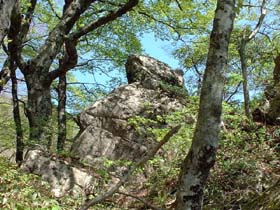 登山道中腹の「大天狗岩」の上でひと休み。岩の頂上からは南東方向に眺望が開ける。