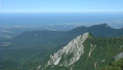 (右)烏ヶ山(からすがせん/1448m)。山頂は大山南壁の絶好の展望台だが、崩落が激しく現在は登山禁止。