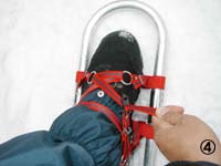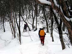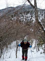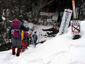 浦石峡入口。ワカンを履き、雪の中へ。沢沿いに藪ヶ峠を目指す。