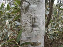 (中)熊の爪痕? (右)イカリソウ。登山道のあちこちに花を咲かせていた。