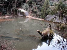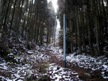 (右)山頂直下の植林帯。日陰で雪がたくさん残り非常に寒い。