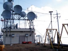 山頂に到着。アンテナと遊具、三角点が並ぶ奇妙な光景。