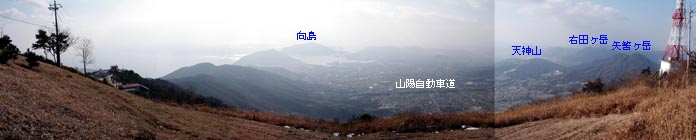 「登山どころじゃない」と言いたいところだが、西麓の古刹・阿弥陀寺から続く登山道を 利用すると(途中で車道を横切るが)静かで落ち着いた山行も可能。山頂からの眺めは 人工物に遮られてもなお余りある雄大なもの。 | |