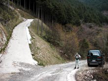 ササの茂る斜面に取りつきながらさらに前進し、右手斜面の上方に林道が現れたので合流。