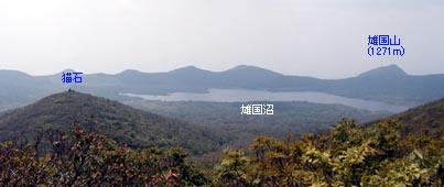 磐梯ゴールドライン(有料道路)を挟み、磐梯山の西側にそびえる山。天然記念物のカルデラ湖、雄国(おぐに)沼の周囲を巡る外輪山のひとつで、山名は昔ここに化け猫が住みついていたという伝説に由来するもの。山頂の隣にある1335mピークには「猫石」と呼ばれる巨大な岩石がそそり立っている。 山の南北は斜面が大きく削られてスキー場となっているが、登山道の周囲はブナなどの自然林が豊か。また、雄国沼には6月はレンゲツツジ、7月はニッコウキスゲが咲き乱れ、多くのハイカーが訪れる。 |