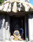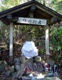 (右)鳥居から多良岳山頂へは、距離は短いが急峻な登りが続く(鎖場あり)。途中には梵字の刻まれた巨岩があった。 |