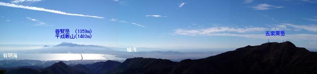 木の枝越しに雲仙や前峰(三角点のある983mピーク)、対岸の九州本土の向こうには阿蘇山や九州中央山地と思われる稜線が連なっていた。 |