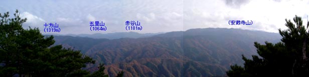南東の眺め。冠山のように見える突起は、実は赤谷山。安蔵寺山は雲に隠れて見えない。 | |