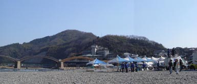 渡り初め記念イベントの準備が着々と進む錦川河川敷に車を停め、まずは岩国山登山口のある椎尾八幡宮へ向かった。 |