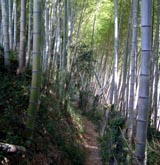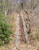 「立入禁止」の看板の隅に小さく「←岩国山へ」の文字。 矢印に従って進むと、道は竹林の中を抜け、葉の落ちて明るい雑木林に出る。 |