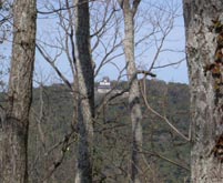(右)西の方、枝越しに岩国城を望む。 少し休んだあと、来た道を折りかえし、錦帯橋を渡って城山登山口へ向かった。 |