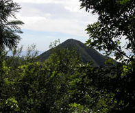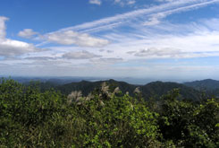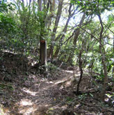 狩音山山頂。西にわずかに海が見える程度で眺望はなく、座って休む場所もないのですぐにUターン。帰りの縦走路では、木々の上から鬼ヶ城の山頂部が顔を出していた。疲れた足を引きずって下山した後は吉見温泉センターに入浴。 |