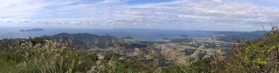 ![]() 山頂からの眺め。ヤブで見えにくい竜王山(左)。ススキ越しの海(上)は風情がある。 |