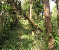 鬼小屋を過ぎると、山頂へ向けての最後の急登。雨が降る日は滑り落ちそうな急傾斜を、木の枝や岩を頼りに上りきると、鐘のつけられたピッケルのモニュメントが印象的な鬼ヶ城山頂へ到着。展望は確かに360度だが、足下の草や灌木の丈が伸びて眺めを遮りはじめていた。少し休んで、狩音山への分岐に戻る。 |