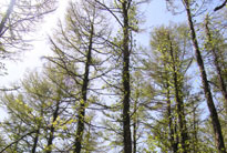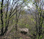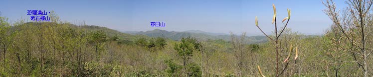 聖山頂までは急坂が全くない緩やかな上りで、雪がなければ道もはっきりしているので楽に歩ける。頂上周辺は新緑鮮やかなカラマツ林。木々に囲まれて眺めは全くない。「展望地」の小さな標識に従い少し進むと開けた場所に出て、岩の上から少しだけ周囲が眺められる。 |