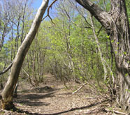 聖山頂から少し引き返し、木にくくりつけられた小さな標識とテープに従い縦走路へ入る。と、いきなりブナ林の中の急激な下り。長い下りの後は少し平坦〜少し上り〜また下り・・・とアップダウンを何度も繰り返すが、最初ほどのきつい勾配はなく楽に歩ける。道も最近ヤブが刈り払われたのか、広くはっきりしており迷う心配は全くない。ただしクマの出そうな雰囲気は濃厚。 |