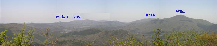 ブナ林の切れ間から見える高岳の山肌は、4月中旬の亀井谷を思わせる淡い色彩のつづれ織り。この美しさはどうしても写真ではうまく伝えられない。長い上りの後平坦な場所に出ると、すぐに高岳山頂へ到着。 晴天に恵まれた連休初日、一組の家族連れが眺めを楽しんでいたが、この登りやすく眺望抜群の山にしては少し寂しい。 |