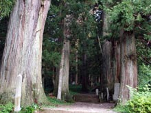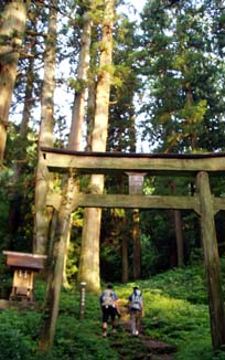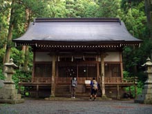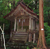 広島県の天然記念物に指定(11本)されている巨大な老杉に囲まれひっそり佇む社殿。その左に立つ木の鳥居の奥に登山道が続き、途中には三宝荒神社、牛馬荒神社、二宮、三宮神社の祠が並ぶ。 |
