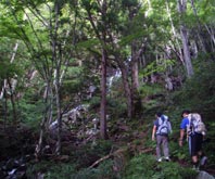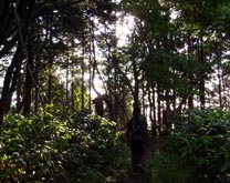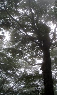 熊野神社奥院でもある御陵。ここもやはり霧の中だったが、何度見ても神秘的で美しい光景にまた会えて、得した気分。御陵と烏帽子山の鞍部から大膳原に下る。この下りは高低差はそれほどでもない(はず)がかなりの急坂で、復路の急な上りが思いやられる。 天気が回復してきたようで、背後から明るい木漏れ日が差し込んできた。 |