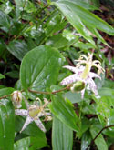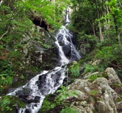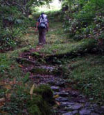 石造りの参道から次第に傾斜を強め、登山道へと変わってくる道。熊野神社から30分ほどで木々の向こうに那智の滝から落ちる白い水の流れが垣間見えてくる。 那智の滝は別名を「鳥尾(ちょうのお)の滝」ともいい、これはヤマタノオロチ伝説発祥の地とされる船通山=鳥上峯に対する比婆山の別名「鳥尾峯」からつけられたもの。 |