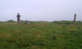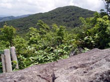 那智の滝からさらに急坂を上ると、「天狗の相撲場」と名付けられた平坦な場所に出る。ここからさらにひと上りで竜王山キャンプ場の水場。ひと休みして広い道を上り森を抜けると駐車場(未舗装)。ふもとから見上げた空は青かったが、竜王山の山上は未だ雲の中にあって周囲は真っ白。驚くほどたくさんのトンボがその中を飛び交っていた。 |