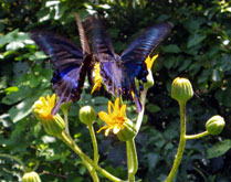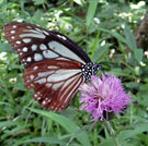 烏帽子山から出雲峠に下り、奥に丸くそびえる毛無山へ。5月の「比婆山国際スカイラン」ではパスしてしまう毛無山中腹の展望地「ききょうが丘」を経由して、毛無山山頂に到着。スカイランではいつも急ぎ足で通過してしまう広い草原のピークは展望もよく、この山の上で初めてゆっくり休憩をとった。足を伸ばして座ると、つま先や膝の上にトンボが次々と止まる。 |