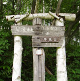 牛曳滝から沢に出て、植林されたシラカバ林を過ぎると間もなく「展示林」の看板が立つ登山口。ここから林道を下るとすぐに県民の森手前の車道に出る。1kmほどで県民の森駐車場に到着。 あらかじめ駐車しておいた車で熊野神社に移動し、今回の全山縦走は無事終了した。 |