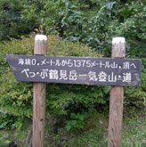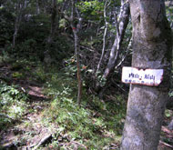 鶴見岳への縦走路は、石楠花尾根で疲れ切った足に追い打ちをかけるような急激な下りから始まる。ガスが出て下の様子が見えないため、下へ下へと落ちてゆくような急坂にもしや道を間違えたかと心配になったが、20分ほどで下り立った平坦地に「船底」の表示板を見てひと安心。ここが内山と鞍ヶ戸の鞍部で、ここからまた急登が待ちかまえている・・・・・。 もうヤケクソ気味で先へ進む。 |