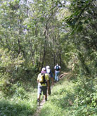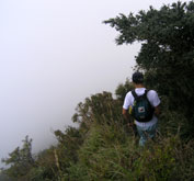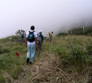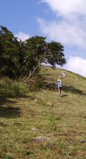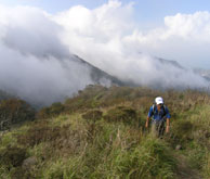山頂付近は道が草やススキに埋もれ、昨年に比べ不明瞭。山頂に出ると雲が多く、眺めも不明瞭だった。(右)はたぶん由布岳。少し休んで鶴見岳への縦走を開始。 内山からは、鶴見岳方面から縦走してくる人とすれ違うことが多くなった(石楠花尾根では1人も出会わず)。どこへ下りて行くのだろう。 高い山から低い山へ縦走していくのが楽なのは当然だが、この縦走路では特にそれが顕著で、この先の道も・・・・・ |