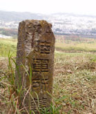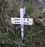 エンジン音が響く森を抜けると、空に向かって広がる草斜面に出る。ここからが扇山登山道のハイライト。急登がいつ果てるともなく続く。(右)草地の中に点在する黒っぽい板は、自衛隊の射撃訓練の的だろうか。登山道脇の標柱には「陸軍所轄」の文字が残る。 |