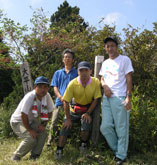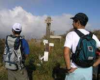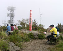鶴見岳山頂に到着。軽装の観光客が行き来する中、疲れ切った顔の縦走パーティーはいかにも浮いた存在だったが、隙を見て三脚を立てて記念撮影。周囲にはまたガスがかかり眺めはなかった。 |