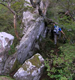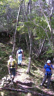 昼食後、石楠花尾根に突入。扇山の直登だけで「疲れた〜」と言っている場合ではなく、ここからが本当にキツイ山行の始まりとなった。その名のとおり初夏にはシャクナゲの花が咲き乱れるのかどうか知らないが、標高810mから1275mの内山まで単純に上っていくものと予想していたこの美しい名前の尾根は、実際は途中で大きくアップダウンし、その後内山へ一気に上るというノコギリ尾根で、市房山の縦走路を思い出させるが、あちらの方がたぶんもっと歩きやすかった気がする。。。 |