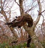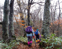 高岳山頂付近の紅葉はほとんどが散ったあとで、ウリハタカエデの枝からはモミジの代わりにたくさんの種子がぶら下がっていた。このあたり、西中国山地の中でも特にクマの多い場所だと聞いているが、今年は台風もなく木の実も豊作で、しっかり栄養をとったクマは道なき森の奥でのんびり昼寝の時間だろう・・・どこか遠くで寝ていてほしい。 最近会ったばかりなので、ササの深い茂みの中が気になって仕方ない。 |