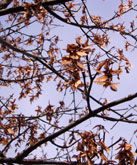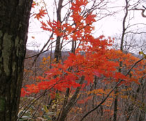 昨年春、新緑の美しさに目を奪われた自然林は、紅葉もやはり美しかった。すでにピークは過ぎていたものの、すっかり葉の落ちた巨木の脇に残された紅葉は、かえって鮮やかさが引き立つように感じられる。 散りかけた紅葉もなかなかに趣深い。 「花はさかりを、月はくまなきをのみ見るものかは」という徒然草の一節を思い出す。 |
