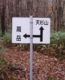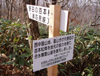 縦走路との合流点に到着、道端で昼食休憩。枝にかけられた「日本分水嶺」の木札には見覚えがあるが、今年の5月にはただの一本道だった。「西中国山地 聖山分かれ野田の百本松間を復元しました」という新しい表札の日付は、平成17年9月17日。2ヶ月前に開かれたばかり。 縦走路を少し移動すると、ササ越しに聖湖や深入山が望まれ、前に通った道の記憶が蘇った。 |