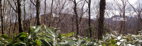 ササ原の上に低木が生い茂った縦走路の展望はあまり良くないが、木々の間から聖山、砥石郷山、恐羅漢山などが見える。恐羅漢の山頂は霧氷で白くなっていた。反対側に目を向けると、木の間から除く山並みの向こうに海が見える・・・ような気がする。周囲の木を刈り払ってしまえば気持ちの良い展望尾根になるのに、と良からぬことを考えてしまう。 |