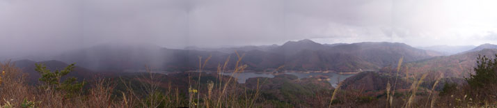 高岳山頂。恐羅漢や聖山、三段峡の方角には日が差しているが、聖湖から対岸の臥竜山は雨雲に覆われ真っ白。雲はすぐにこちらへも流れてきて、みぞれ混じりの雨が落ち始めた。展望を楽しむ時間もなく、慌ただしく雨具を着込み聖湖畔への下山路を急いだ。下山後、芸北オークガーデンに入浴し、民宿「へいま」で1泊。 |