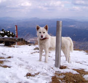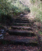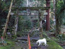 駐車場の近くにいた犬が、人懐こそうに周りをうろうろ、脇道に入ったり戻ったりしながら一緒に石段を上りはじめた。近くの民家か、寺で飼われているものと思っていたこの犬は、本堂を過ぎてもなお一緒に登山を続けたい様子。ただし、登山道をまっすぐ歩くのではなく、森の中に駆け込んだきり姿が見えないと思っていたら後から追いかけてきたり、先に行ってしまったと思うと「早く来い」と言いたげに戻ってきたりとせわしない。 |