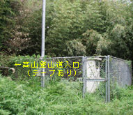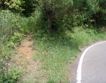 広い舗装路はカーブを繰り返しながら麓に下ってゆく。途中、右に大きくカーブする手前にある中国電力無線中継所の反対側に標識のない細い地道があるが、これが行者様への縦走路。両脇に草が生い茂っていて不安になるが、入ってみると踏み跡はしっかりしており、テープもあるので迷う心配はない(行者堂までは)。 |