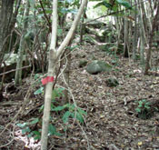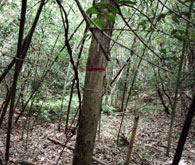 坂をいったん上りきり少し広い場所に出ると、道はまたヤブの中に逆戻り。目印のテープは右手の湿地帯の中へと続いているが目立った踏み跡はなく、木や竹の間をすり抜けながら先人の後を辿る。何となくマムシがいそうで気味が悪い。登山道は湿地帯左手の斜面に移り、黒いパイプ(山頂展望台のトイレ用?)に沿って急坂を直登することになる。 上りの途中ではとぐろを巻くマムシに遭遇した(やっぱりいた!!)。 |