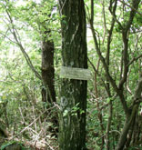 縦走路は最初いきおい良く下り、鞍部(ここから高良地区への下り道が分岐している)から上りに転じてすぐに行者堂前に出る。行者堂の先からはテープ伝いに斜面を直登し尾根を目指す。尾根に出るまでは木にテープがつけられており安心だが、尾根に出たとたんに目印が全くなくなり途方に暮れる。東の方へ、踏み跡らしきものを頼りに進んでいくと、大岩と木々に囲まれた少し高そうな場所に出る。たぶんこの辺が山頂だろうと、標識を探してみたら・・・ |