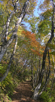 深まりゆく気配がなかなか見えなかった秋がようやく重い腰を上げはじめた。出足が遅かったぶん、今年の紅葉は駆け足とのこと。好天に恵まれた3連休初日、県民の森駐車場は朝から車があふれそうなほどの盛況。大勢に見られたからといって減るような紅葉ではないが、急いで準備をすませ、毛無山の登山道へ入った。 |