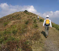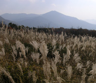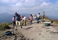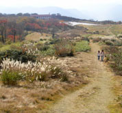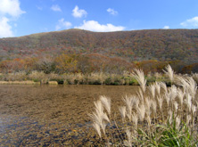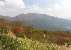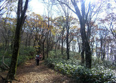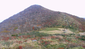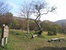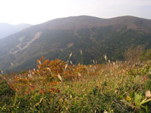 草刈りが行われたのか、閑散として見通しがよい大膳原。以前来たときによく見かけたリンドウの花は、ほとんど見あたらなかった。紅葉は、遠目にはそれほどでもないように見える。山頂への上り道にも目立った色はなかった。 |