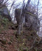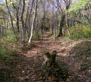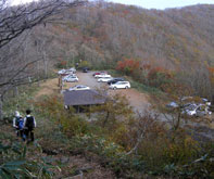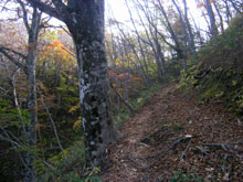 色あせた立烏帽子山の上りでは、意外に多くの登山者とすれ違った。この時間だと池ノ段で折り返しか。山頂を足早に通り過ぎ、ブナ林の中を下って駐車場前に出ると、まだ多くの車が停まっていた。 ここからは展望園地を通らず、千引岩から越原越を経由して県民の森に下山するルートをとった。 |