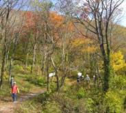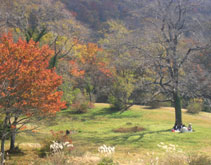 ピークを迎えた紅葉の中、山に登る人、森を歩く人、写真を撮る人、眺める人。休暇村の駐車場は県民の森以上に混雑していた。 建物のそばで昼食、休憩の後、南の原経由で大膳原へ引き返した。 |