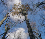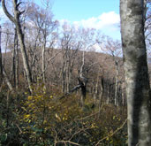 大膳原から比婆山へ、急坂を上り分岐点(左画像の"大膳原"方面標識の傾き具合!)から御陵方面に進むとすぐにブナ林の中に入る。いつもと比べ、やけに明るいなぁと思ったら、ブナの枝にはほとんど葉が残っていなかった。 |