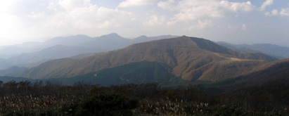 (左)南の原から池ノ段、立烏帽子山遠望。(右)大膳原からススキ越しに望む福田頭。 |