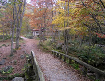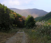 千引岩〜越原越の道を通る人は他になく、この周りはちょうど山のかげに入り日差しもないので余計に寂しく感じられた。越原越から林道に下る道も人影はなく、数時間前の吾妻山のにぎわいがうそのよう。林道の向こうにそびえているのは牛曳山・伊良谷山。傾いた陽を受けて、山肌はほんのり赤味を増したように見える。毎年のことだが、ほんとうに日が短くなった。 温泉を出て庄原ICに入る頃には、あたりはすっかり暗くなっていた。 |