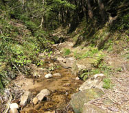 雑木林の中を流れる小川に沿って続く道。日差しが明るく、新緑がきれいで鳥や蛙の声も弾んでいるように聞こえる。 途中何度か流れをまたいだ後、右手の斜面に取りつき高度を稼ぐ。渓流は見る間に眼下へ、水音も聞こえなくなった。 左手に深く切れ落ちてゆく谷を見送り、ジグザグにつけられた急坂を上ると平坦な「中城跡」に飛び出した。汗を拭き、息を整える。 |